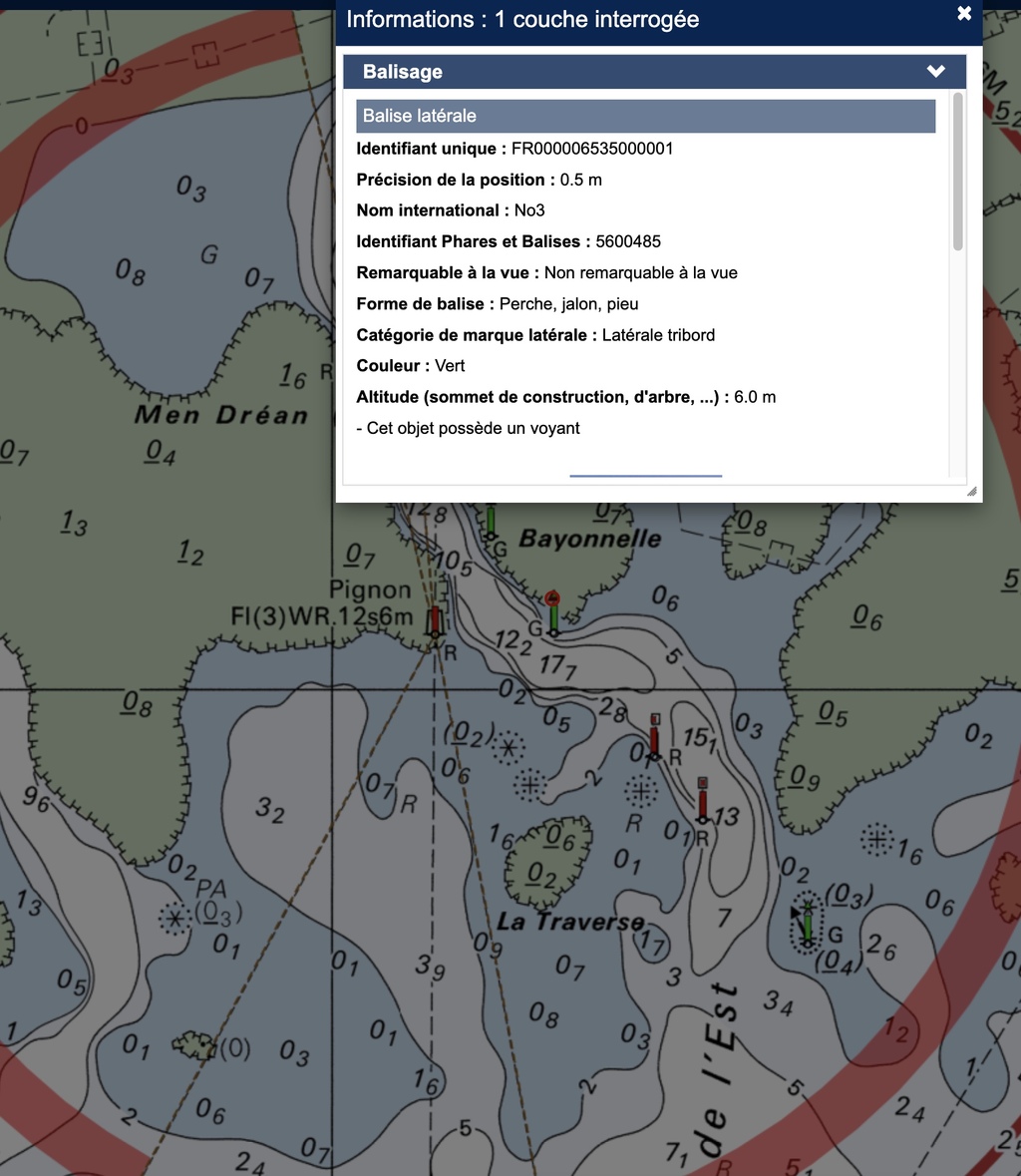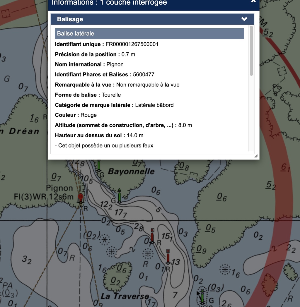 La balise tribord est géolocalisée à 0,5m près, la tourelle rouge bâbord "Pignon" est positionnée sur la carte à 0,7m de précision.
