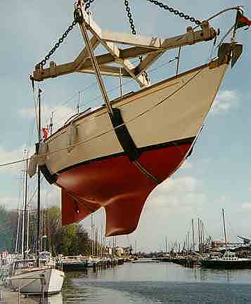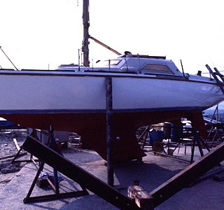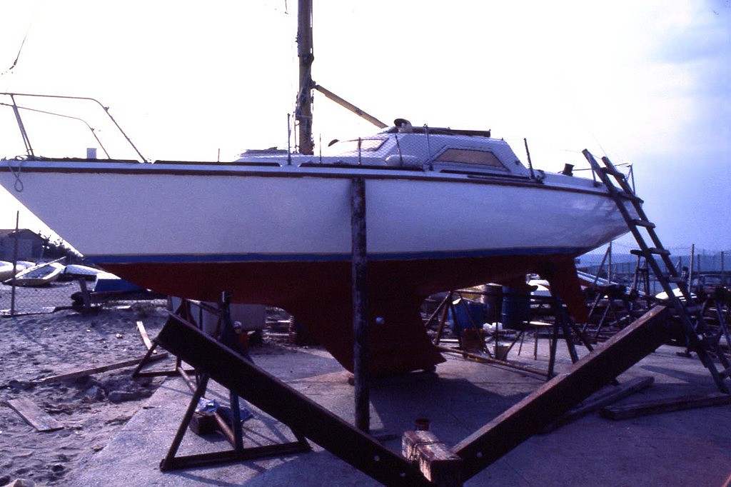 Cela paraît logique, j'ai quand même eu de bons résultats sur un CAPRICE puis sur un AQUILA au rouleau, fini au spalter. Le KELT, on l'a fait à l'airless, ben quand même, il n'y a pas photo. Enfin si, en dessous. Tiens, le mauvais photographe a pris le CAPRICE avant de décacher la bande de flottaison, c'est malin. Ce serait maintenant, je l'aurais faite à l'adhésif.