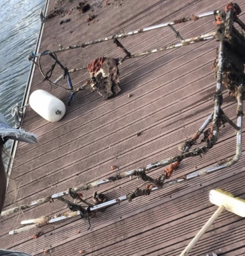 Récupéré un portique après un an sous l’eau. Opération intéressante. J’entends tout et son contraire que l’inox ça cristallise sous l’eau. Qu’on le voit pas que c’est à cœur. Etc.