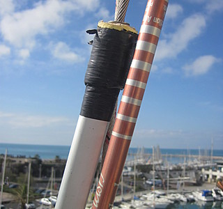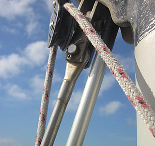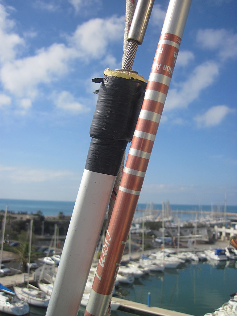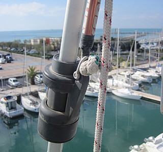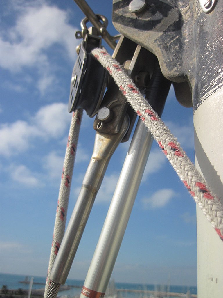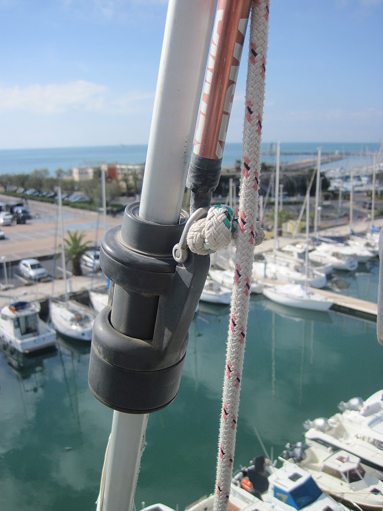 J'ai remplacé la drisse d'enrouleur par une drisse de plus petit diamètre, avec l'échelle de mat, je suis monté pour constater la pliure. En consultant les forums et les sites des fabricants, l'angle de 10° est recommandé, mais je n'arrive pas à estimer la force de la poulie de renvoi.