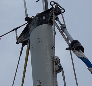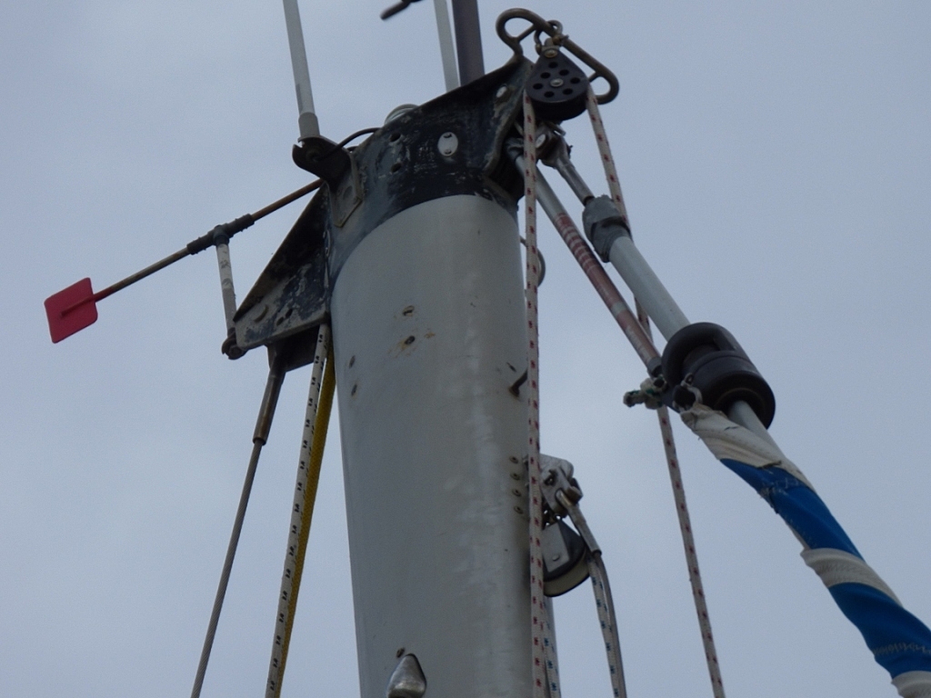 Ça se présente comment? Il me semble voir des restes de quelque chose qui devait être fixé au mat vers là..........