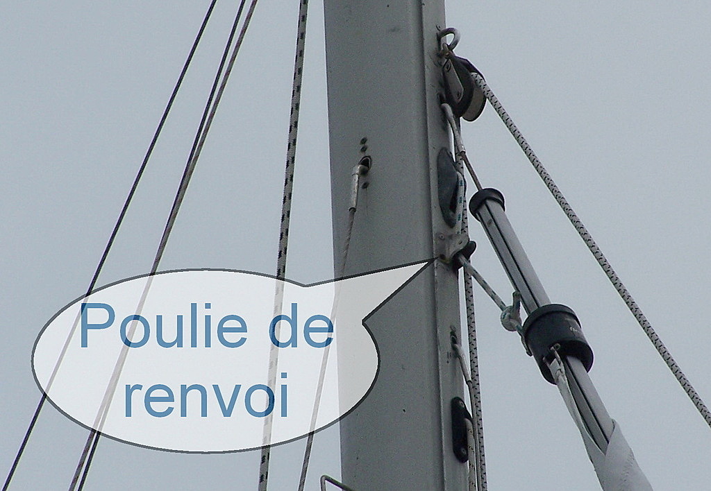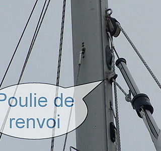 C'est vrai que c'est mieux avec un poulie de renvoi, il y en a de speciale en 2 parties a insérer dans une saignée a faire dans le mat, et a riveter ,