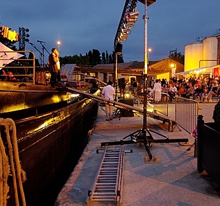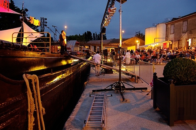 une peniche dans laquelle ce trouve les loges , la regie ,la scene etc tout le materiel et les spectateurs sur le quai .
