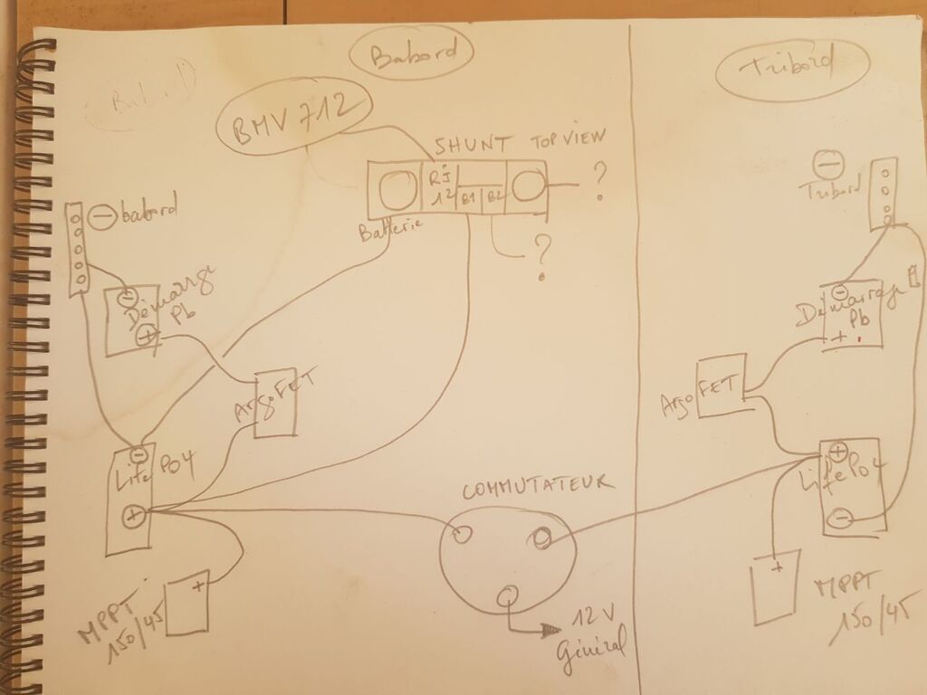 J'ai parcouru moults publications concernant l'installation d'un BMV712. J'en suis toujours à me demander ... l'existant c'était : toutes les batteries dans une coque, avec le BMV. Depuis quelques mois j'ai installé une LiFePo4 et une plomb dans chaque coque, pour, entre autres, récupérer l'énergie de chacun des alternateurs et des deux parcs de panneaux solaires.