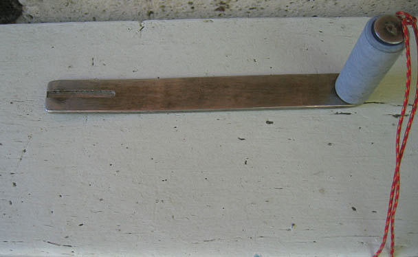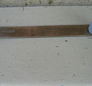 Photos de ma manivelle ! Je n'en ai jamais trouvé de ce type. L'encoche est fraisée dans le métal, sur la face supérieure uniquement. Sur la photo de profil, je crois que la légère courbure est une déformation due à l'usage, et qu'au départ la manivelle était tout à fait plate.