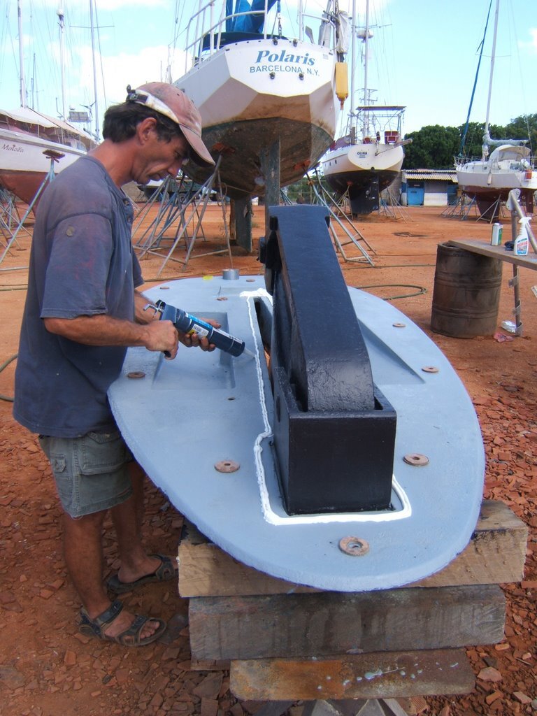 Malheureusement j'ai fait une erreur en posant le scellant car l'ouverture de dérive est plus large sur la coque que sur la plaque de fonte....Donc à faire attention à ce détail...