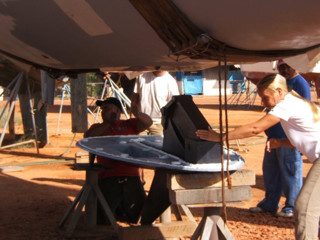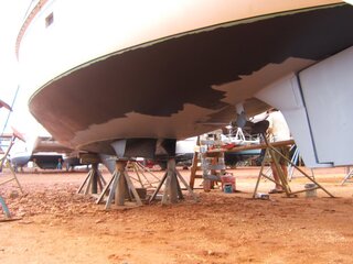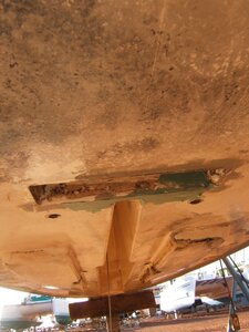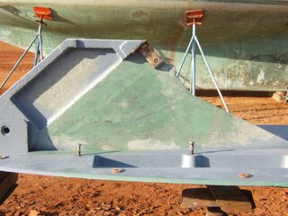 J'ai passer à travers cette lourde expérience.D'abord j'ai percé avec une mèche emporte pièce chaque côté du puit de dérive où après plusieurs mesure j'avais situé le centre de l'arbre sur lequel pivote la dérive et que j'ai enlever.Puis j'ai déboulonner les 11 boulons qui retiennent la quille mais cela après avoir installé deux série, avant et arrière de bloc de bois monté en cage pour soulever légèrement le tout.Toute la quille en forme d'oeuf est descendu