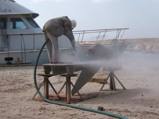 Déboullonnage et (boucher les trous pour éviter les saletés), séparation du lest et de la dérive (la dérive vient avec le lest) avec le travel lift.
