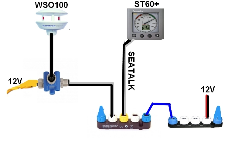 Enlever le connecteur bleu qui est entre le hub et le WSO100 et relier l'anemo avec un cable branche de moins de 6m (norme NMEA2000), sinon utiliser un T avec terminaison qui se branchera sur le bleu du hub avec un cable dorsale et remplacera la terminaison