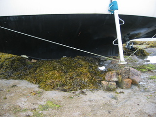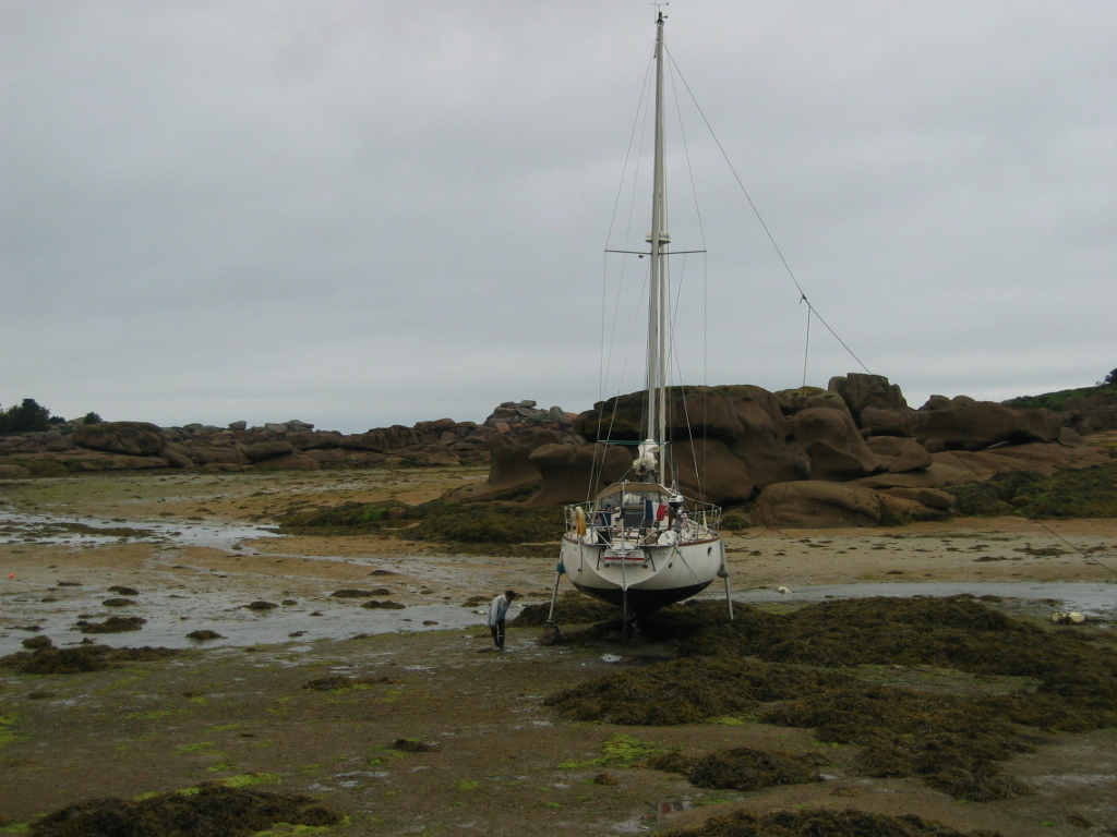 Pour une raison qui m'échappe, je décide de faire demi tour plutôt que d'avancer et de poser tranquillement la quille sur le sable. C'est pourtant ce qui était prévu. Béquilles ou non, le bateau pose très bien sur son flanc (pour l'après midi).