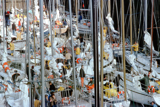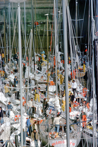 "Au coup de canon devant Cowes, le vent était établi à 40 nœuds. Cela « fumait ». Seuls, Bermudes, Cider & Roses, Oystercatcher et nous même envoyons le spi tribord amure, plein vent arrière..."