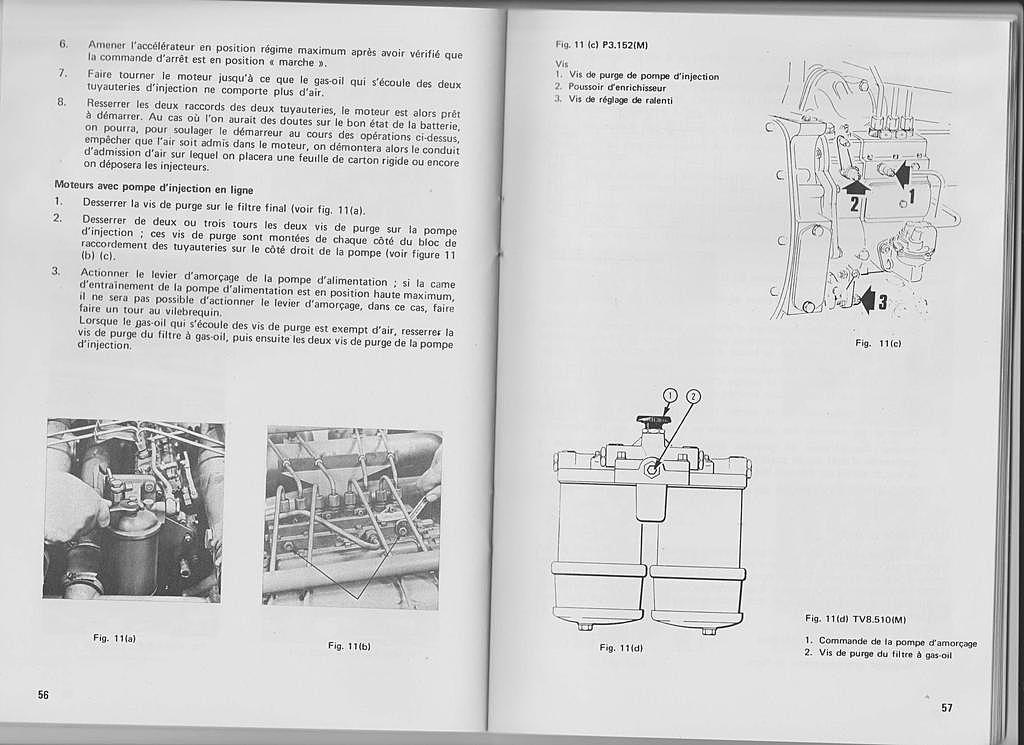 Les reamorcages dépendent de chaque moteur. S'il y a un retour, ce qui est le cas du 4236, c'est déjà plus facile car si l'on pompe sans rien ouvrir,l'air finit par partir par ce tuyau, a la seule condition que la came de la pompe soit bien placée cad que la pompe fonctionne. Après il faut ouvrir 2 raccords d'injecteur et faire tourner le démarreur jusqu'à ce qu'il pisse. A ce moment on ressere et ca doit démarrer.. Certains moteurs renvoit le retour sur l'arrivée et la, c'est la panade..