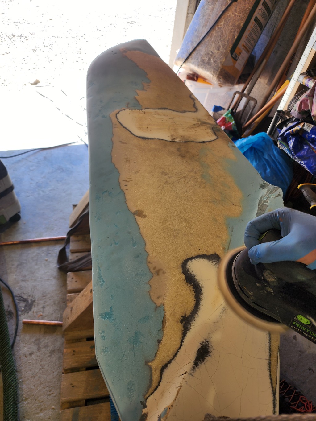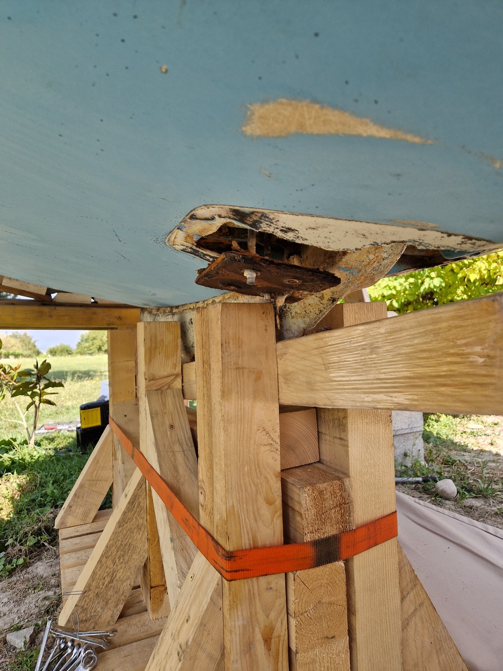 J'envisage de poncer jusqu'à la fibre sous la ligne de flottaison pour renforcer la bestiole et repartir sur des bases saines.