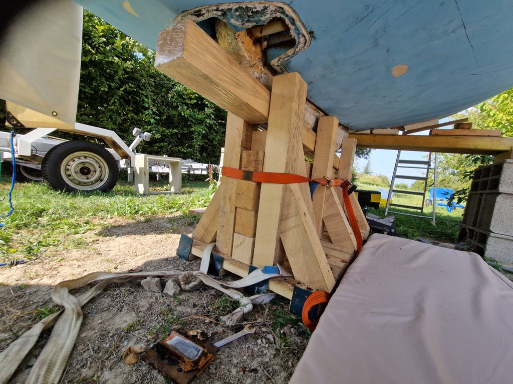 xatophe:Si on prend le chantier tel qu'il est sur la photo on voit 2 "tour" d'une hauteur de 4 parpaings + quelques chevrons. On double une des 2 tours par 3 parpaings, on pose le cric dessus. A partir de la on peut rajouter ou retirer un chevron. Comme le bateau est soutenu en son centre il montera ou descendra d'une hauteur d'un demi chevron. Faire la même opération de l'autre coté, puis à l’arrière. Vu la faible hauteur de déséquilibre à chaque opération le bateau ne glisse pas, par contre c'est un peu long. Sur la photo la remorque vient d’être retirée, il faut maintenant refaire l'opération en sens inverse pour ramener le bateau à une hauteur raisonnable pour travailler dessus. Jean ·le 18 mai 2023 23:45