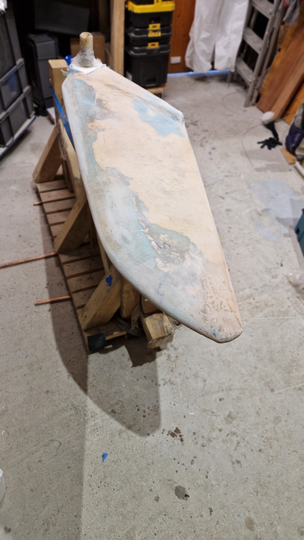 Ensuite, mastic epoxy pour redonner la forme de la quille. J'ai utilisé MaxiEpoxy770 pour son ratio volume/prix. Il est agréable à travailler mais c'est vraiment pour combler des volumes, contrairement au watertite.