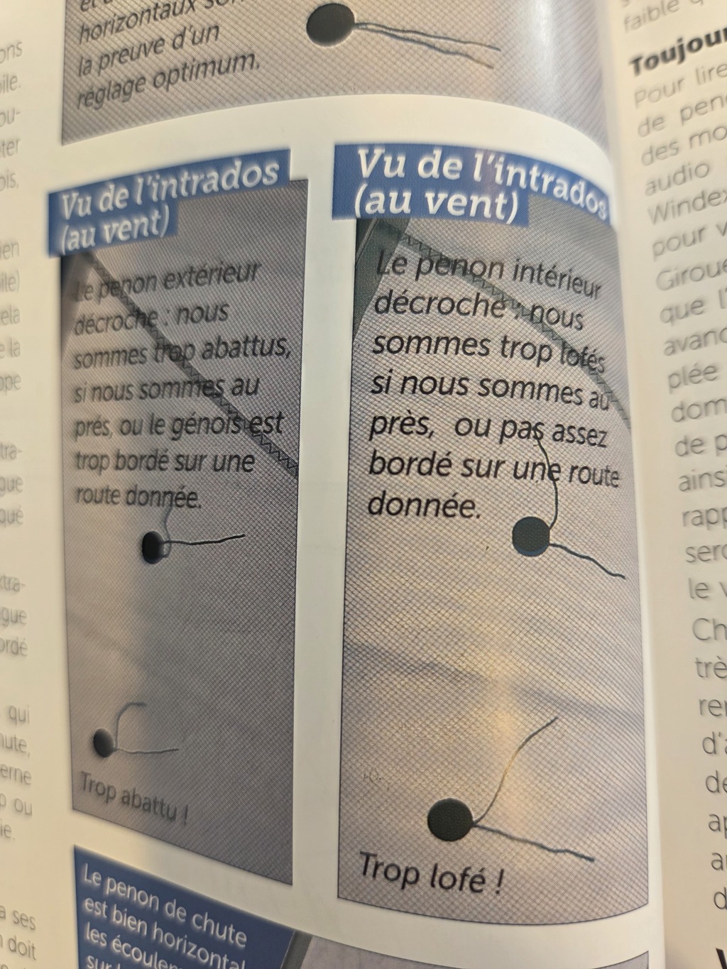 Si le penon sur l'intrados se matte, pareil, c'est qu'on est trop abattu ou que la voile est trop bordée. S'il décroche et fasseye c'est qu'on est trop lofé ou trop choqué selon la route souhaitée.