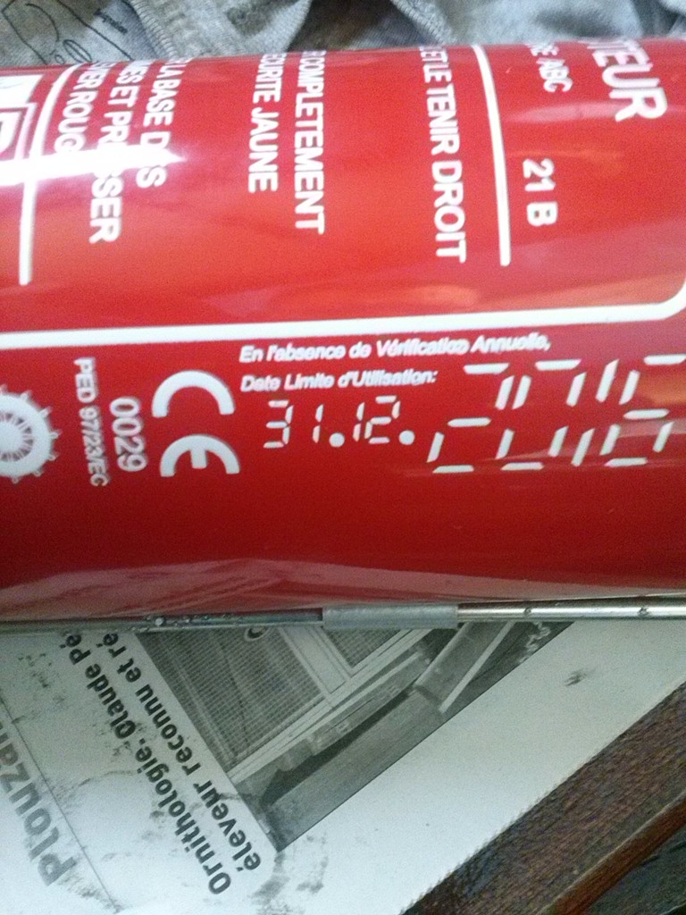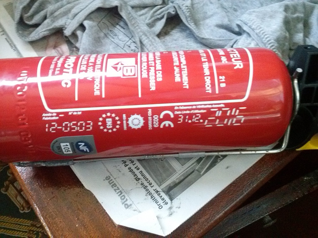 J'ai aussi un extincteur acheté chez Lidl, 12 € je crois. Il est écrit une date de validité, comme le P.. S.., et cette validité peut être prolongée si vérification.