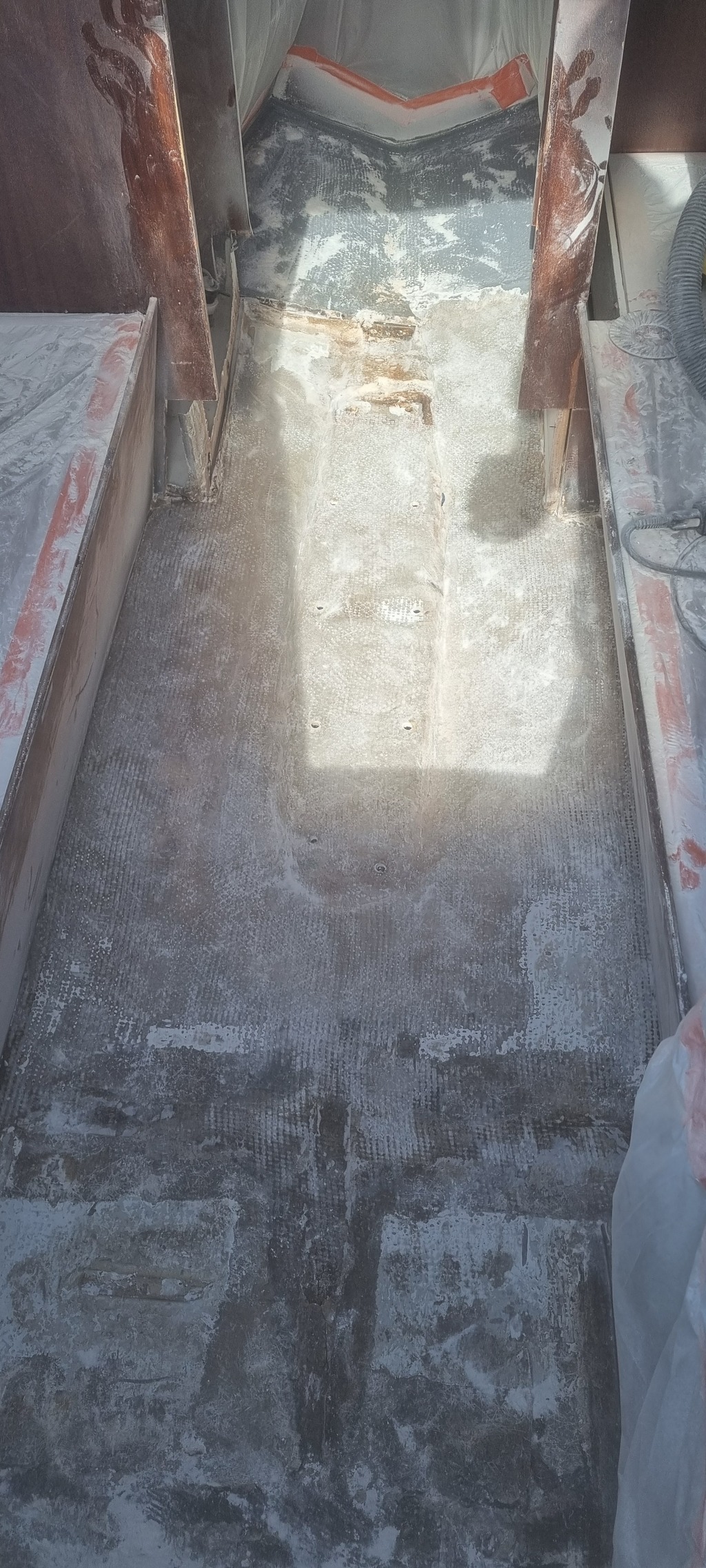 Prochaine étape : Finir de décaper le fond de coque jusqu'à la descente vers l'arrière et la couchette vers l'avant + Décaper les bas de menuiseries sur 20 cms pour les retours de strat du fond et des varangues + décapage des intérieurs de menuiseries pour bien transmettre les efforts le plus "haut" possible.