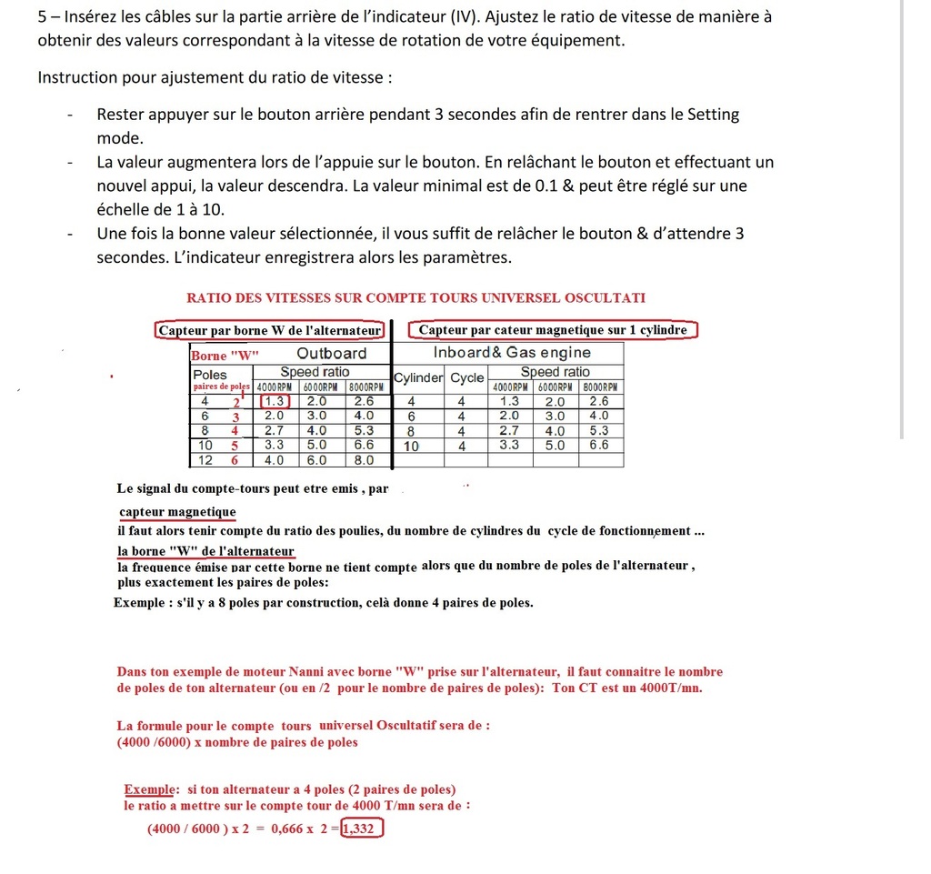 Pour ton compteur universel Oscultati branché sur la borne "W" de l'alternateur, je pense que la seule information nécessaire *au reglage du ratio est le *nombre de pôles de ton alternateur.