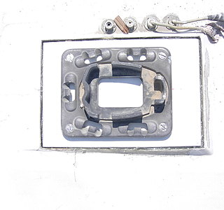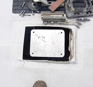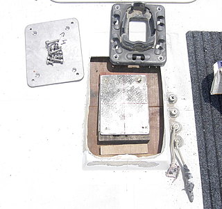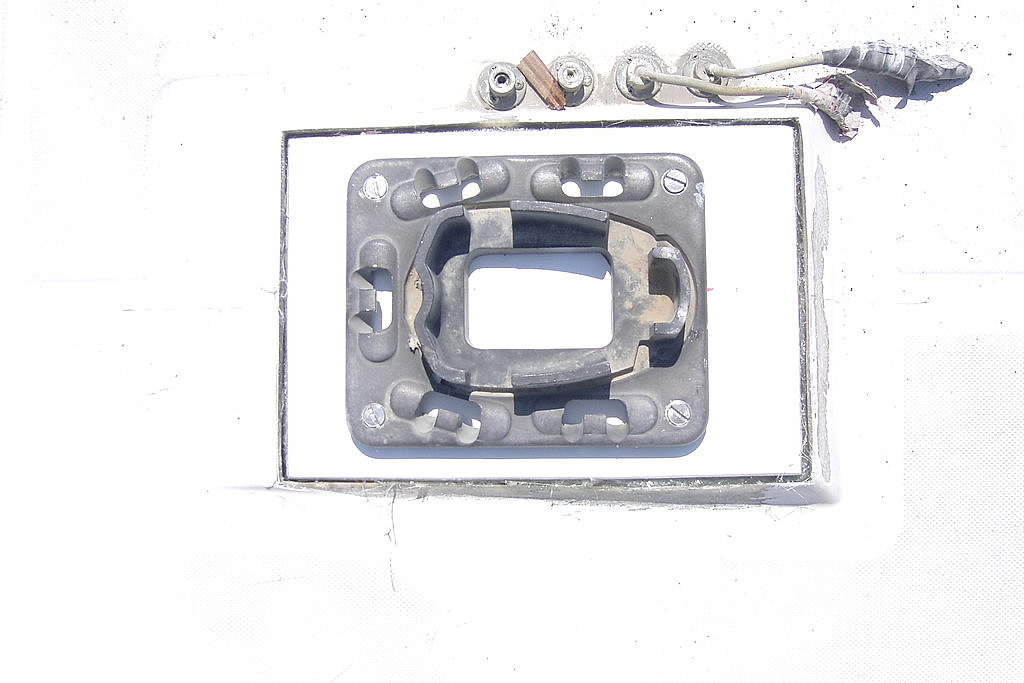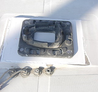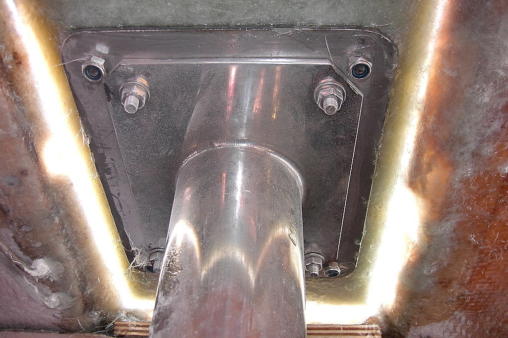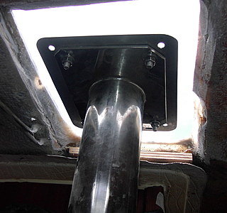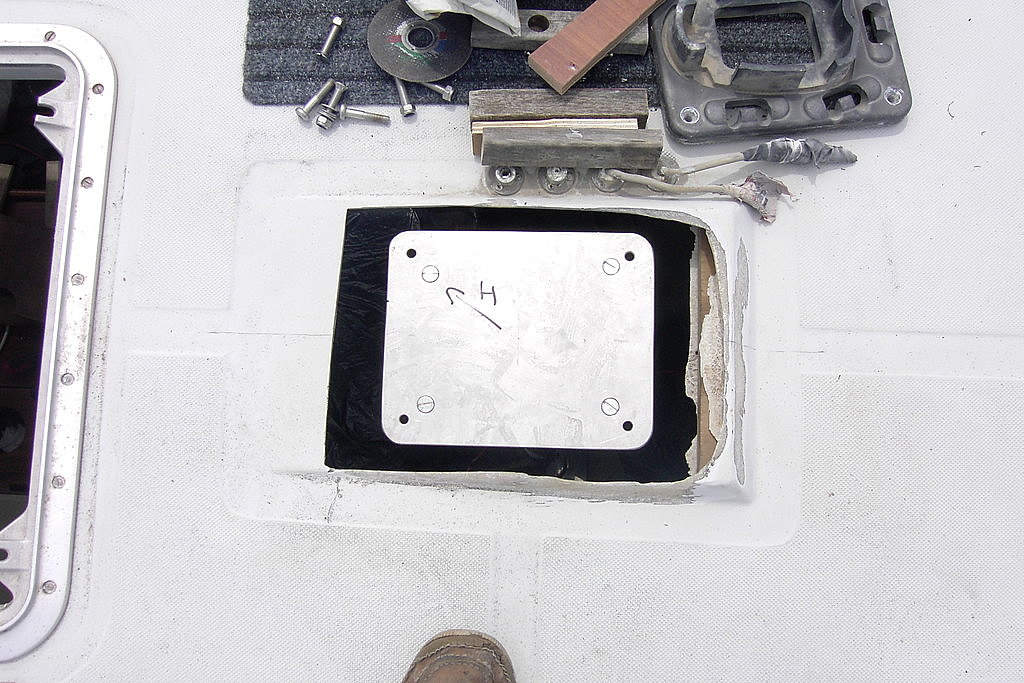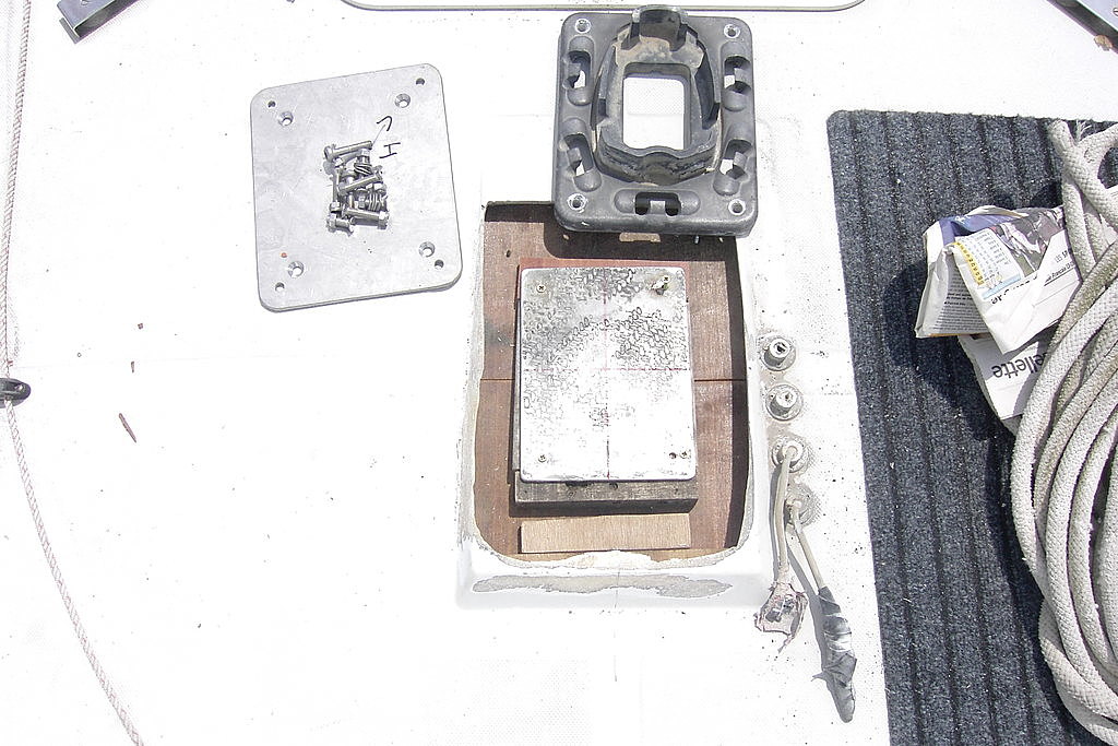 Une fois la varangue réparée avec tissu de verre et résine, j'ai stratifié sur les retours de galbord au dessus du puisard deux tasseaux de 10x10 cm, sur lequel reposaient les cales du mât, puis une plaque en alliage léger et enfin le sabot du mât.
