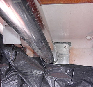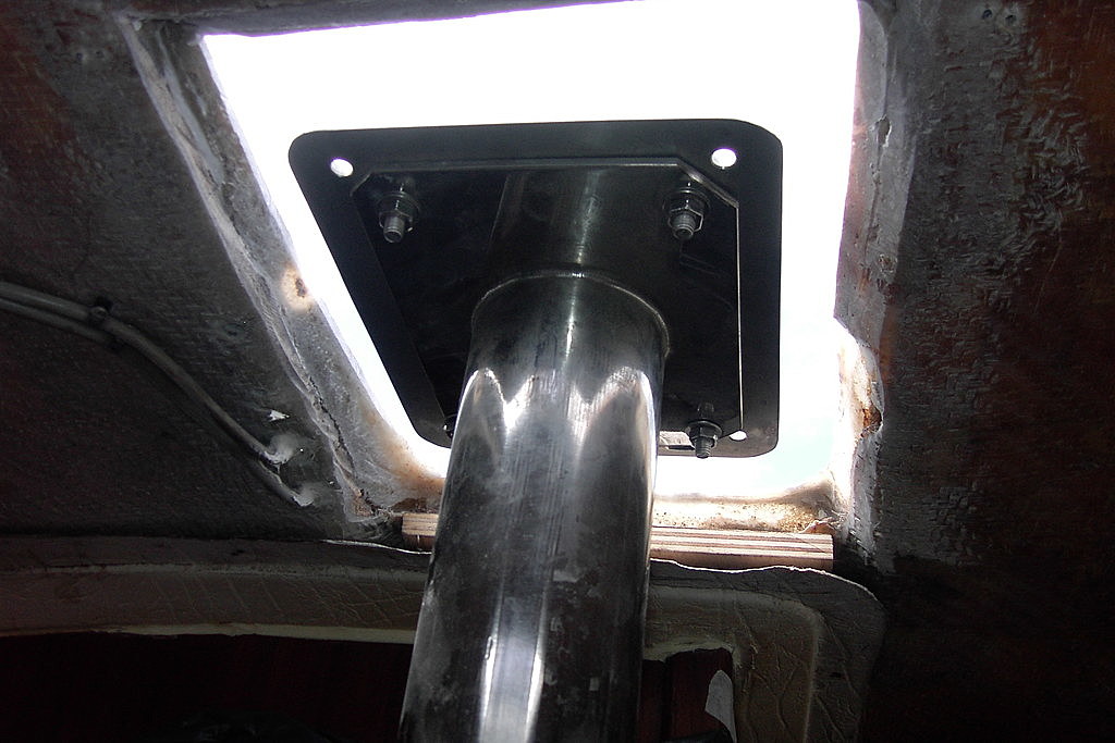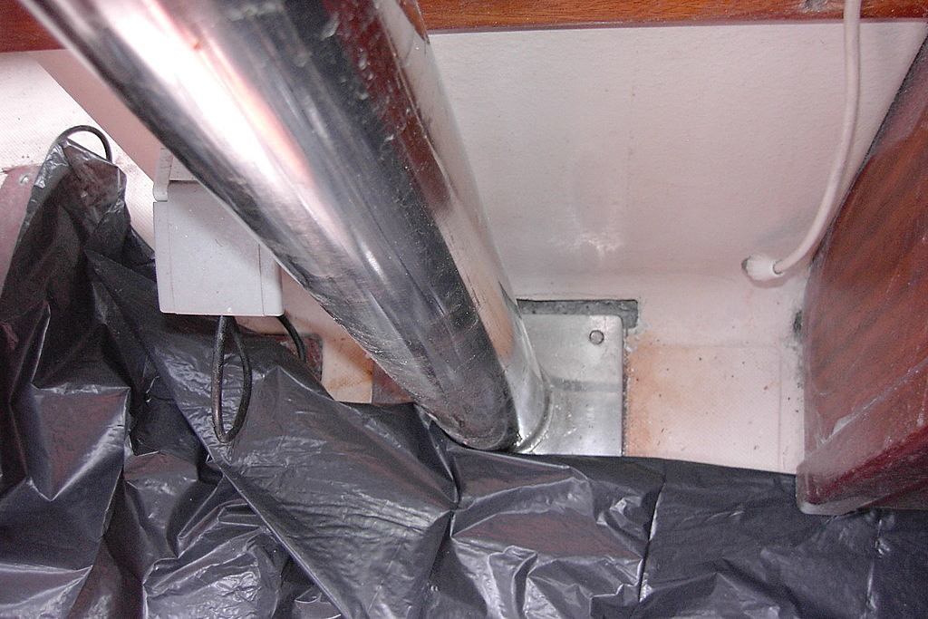 L' épontille en CP sous le mât est stratifiée, la strat est partiellement décollée en avant du mât (sous le caillebotis de douche) et le CP est noirci. Le mât me parait aussi un peu décalé latéralement.