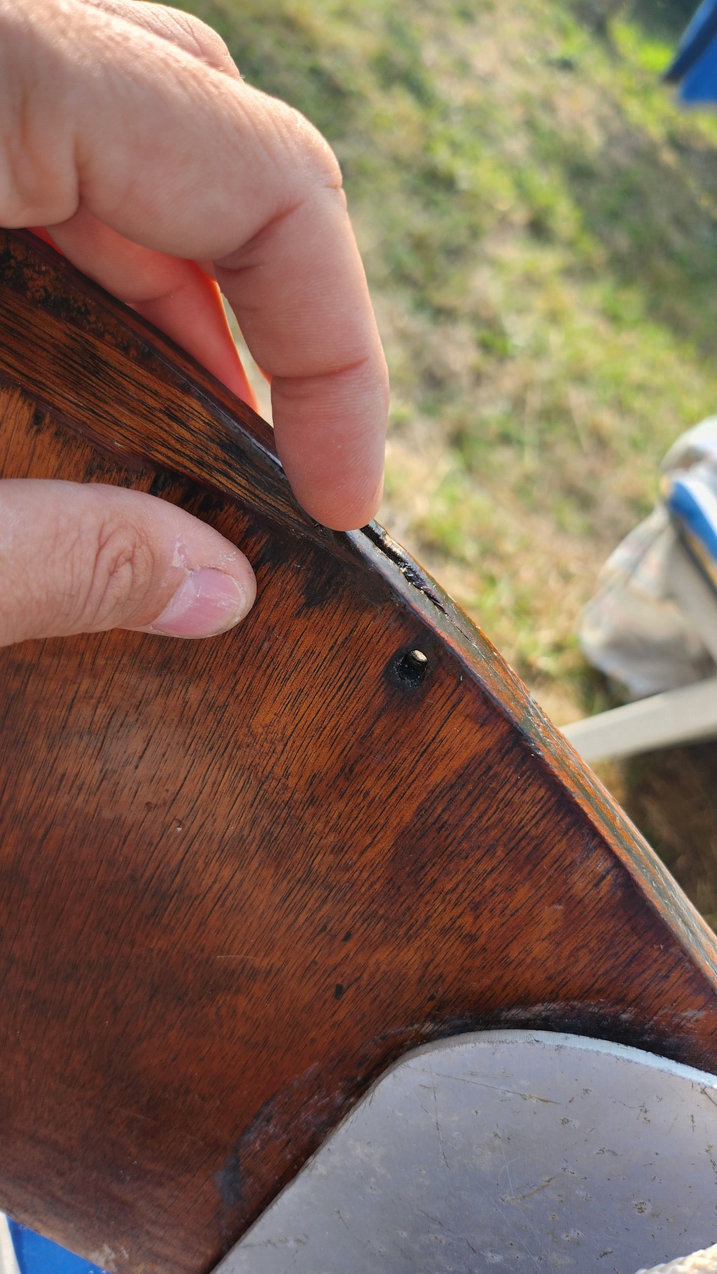 Nous galérons un peu avec notre (très!) beau bateau et là, nous avons du changer le bout du safran.