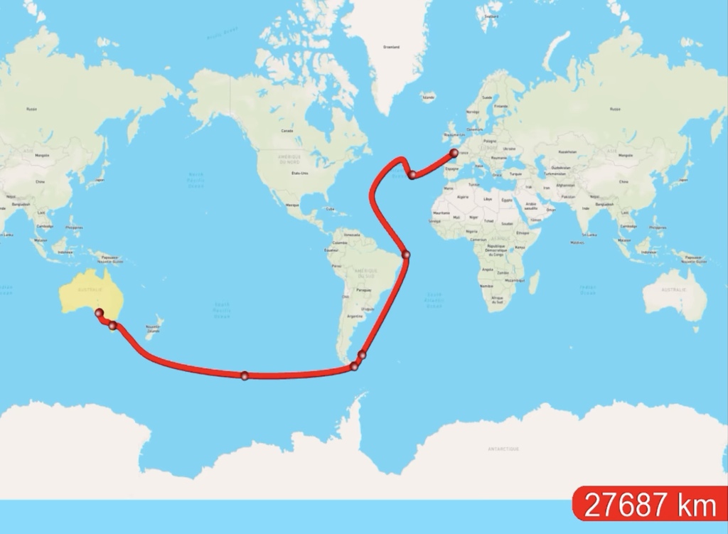 il y aura des étapes bien sûr, on est pas en régate, il s'agit d'un convoyage de sagesse. Mais en passant par le Cap Horn, pas par le canal du Panama, ni par le Cap de Bonne Espérance.