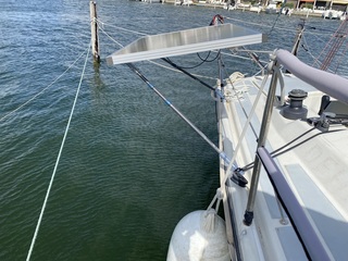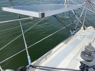 Panneaux solaires > j’ai opté pour 2 panneaux rigides montés sur les filieres, avec des mats telescopiques alu. Un peu de bricolage mais très content du resultat, ça ne bouge pas trop en nav, c’est reglable en inclinaison, c’est amovible en cas de mauvais temps en 3 min.