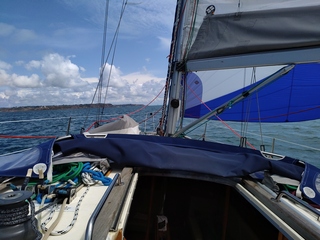 Sinon, j'ai refait tout l'intérieur, mis le chauffage et eau chaude, refait l'électricité, monté un guindeau 1200w, découpé une jupe dans le tableau arrière, posé un hale-bas rigide, posé du Treadmaster dans le cockpit les hiloires la jupe et sur la baille à mouillage, changé les filières, toutes les drisses, installé un code 0 avec bout dehors, etc, etc, etc... J'ai dû passer au 500 heures de boulot sur ce SS ( Gwenn ha Du) cet hiver. Le résultat est à la hauteur de ce que j'espérais et nous sommes très contents de ce bateau.