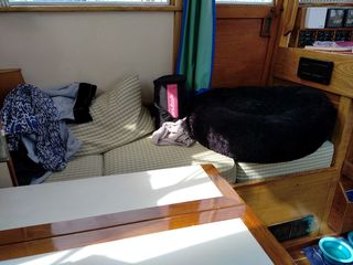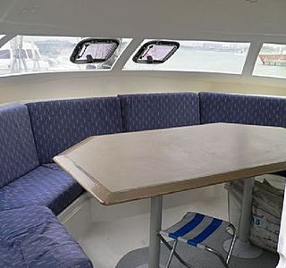 un siège amovible sur le seuil de la descente, bien à l'abri sous la capote et la commande du pilote sous la main, un petit coup d'oeil de temps en temps sur l'ordi sur la TAC à proximité, ça c'est quand je suis en solo par mauvais temps, si on est plusieurs, stationner dans la descente c'est hors de question