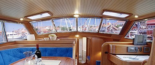 Une alternative à la timonerie: la capote fermée sur l'arrière. J'ai ainsi fait mettre sur l'arrière de la mienne un coupe-vent transparent qui se ferme par des velcros et qui en position beau temps se replie sur le toit de la capote, à l'intérieur. Génial pour la navigation en Manche ou dans les eaux fraîches (Ecosse Irlande). Cela ne remplace évidemment pas la timonerie pour des navigations plus extrêmes.