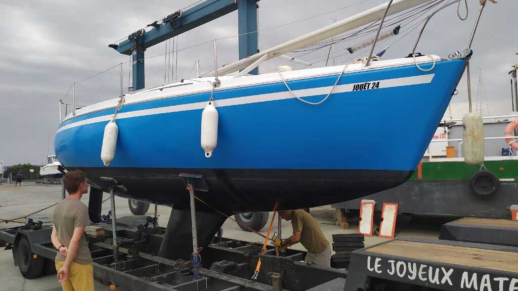 Une pidte. Mon Jouet 22 avait fait Royan Fécamp posé sur un ber hydraulique (loué) posé sur un plateau porte voiture et tiré par un petit camion benne.