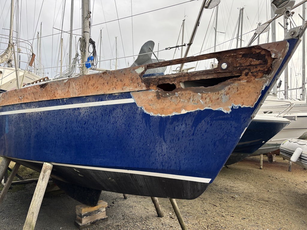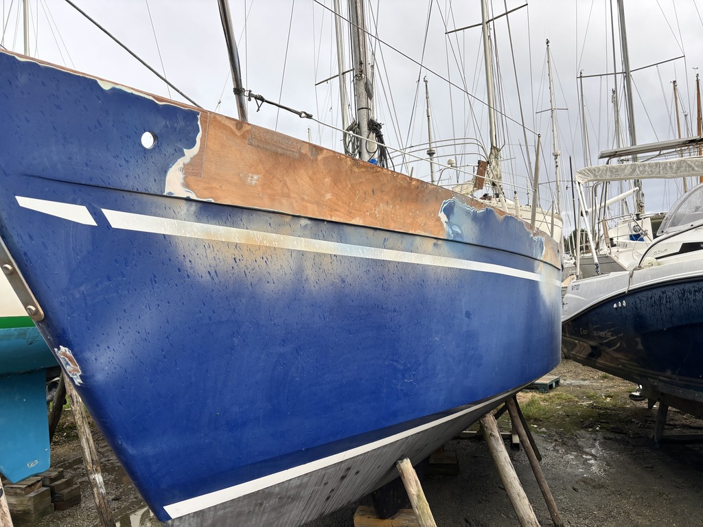 Bon bah ça y est. Sortie de grange pour ce cabernet de 1978. Il était chez son ancien propriétaire depuis 33 ans. Numéro 56 de la série (un signe) nous sommes désormais les sixièmes propriétaires. Objectif scilly été 2027. Je suis preneur de tous les articles et avis pour l’optimiser à fond pour une navigation semi hauturière avec 3 enfants! C’est notre nouveau van flottant. D’où son nouveau nom Ti Bageal. La maison qui flotte. Le bateau est en séchage au chantier du Bono à côté d’un muscadet en attendant la rénovation du bordé tribord et du pavois.