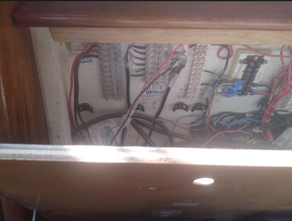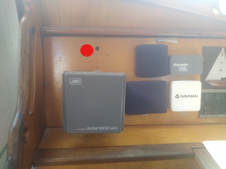 ■ Premièrement, la position du calculateur. Le plus simple et le plus ergonomique serait de placer le calculateur sur le tableau de bord de la table à carte (voir photo avec point rouge). Mais n'y a-t-il pas un risque de trop de perturbations électromagnétiques du fait de la proximité de quelques fils derrière (essentiellement des fils de signal NMEA, et quelques fils d'alimentation a plus de 20 cm, voir photo) ? Il y a aussi la proximité de de l'afficheur radar, avec son gros câble qui va au radôme. Autre interrogation : j'ai parfois à ouvrir ce panneau pour intervenir derrière, et je n'ai pas de garantie que quand je le revisse le positionnement soit identique au millimètre. Est-ce grave eu égard à la calibration ?