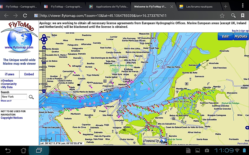 Fly to Map : on dirait que l'application androïd n'existe plus, donc pas de cotes françaises a priori ( a confirmer quand même auprès de Flytomap). Mais pour le prix a l'époque ( 4,99€), j'ai la mediteranée, dont les cotes africaines, ce qui complète ma Navionics ''Europe".