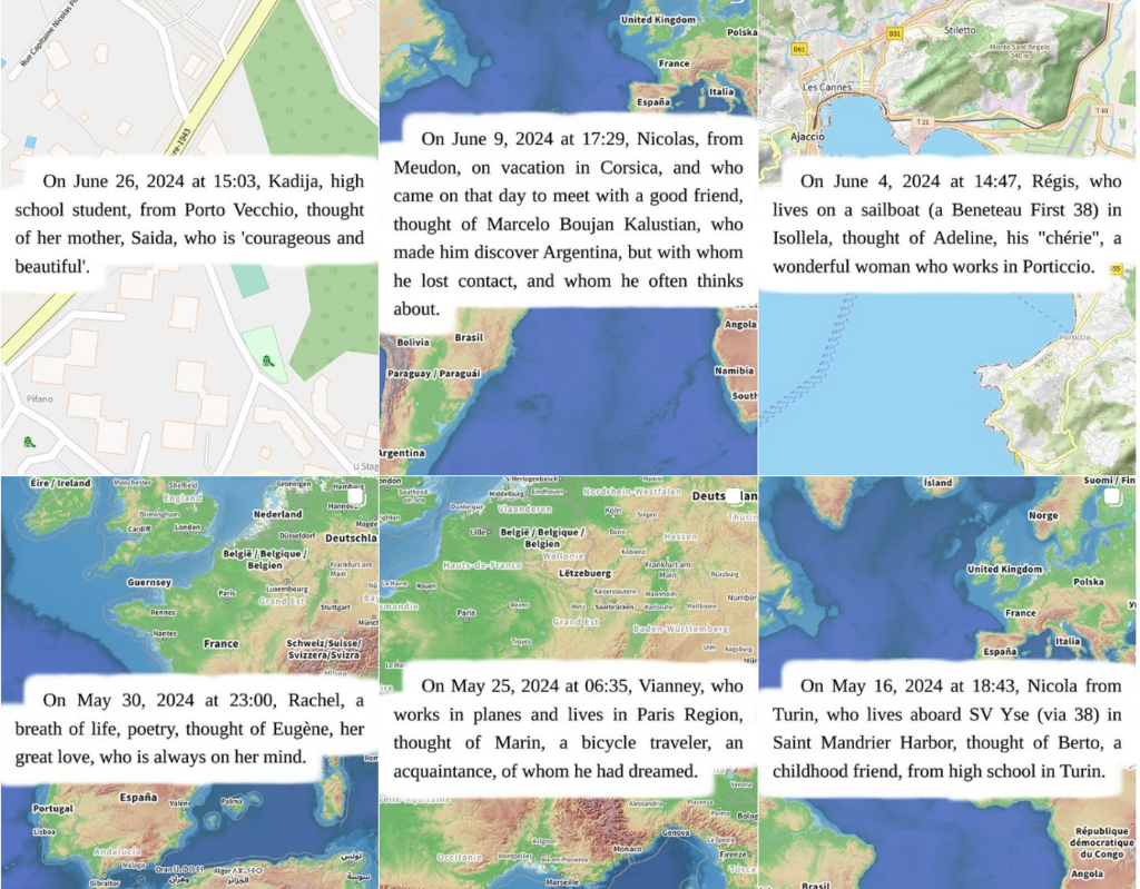 • C’est d’abord un projet artistique, relevant de l’art contemporain, art relationnel, participatif, cumulatif. Il s’agit d’un registre de pensées orientées vers l’autre. Concrètement, lors de notre itinérance vélique, je demande à des gens que je rencontre de « penser à quelqu’un ». Ensuite, je remplis un rapide formulaire dans lequel je précise le lieu, la date et l’heure de la pensée, le destinataire de la pensée, etc. L’œuvre consiste en un registre de pensées orientées vers l’autre. Le registre a une forme physique, papier, mais aussi une forme numérique : chaque pensée est convertie en un NFT (Non Fungible Token) enregistré dans une collection sur une blockchain. ()