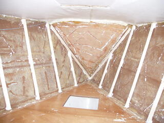 pour le refit d'un Espace 1100 dont l'intérieur était dans un état lamentable, nous avons utilisé de la colle polyester pour coller les tasseaux sur lesquels nous avons posé des lattes.