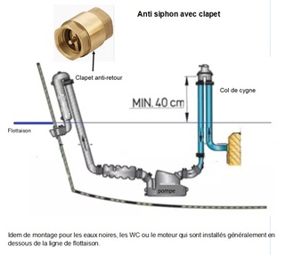 Pas besoin qu'elle soit montée à l'envers, comme la pompe moteur, stoppée, elle n'est pas étanche et n'empêche pas le siphonage.