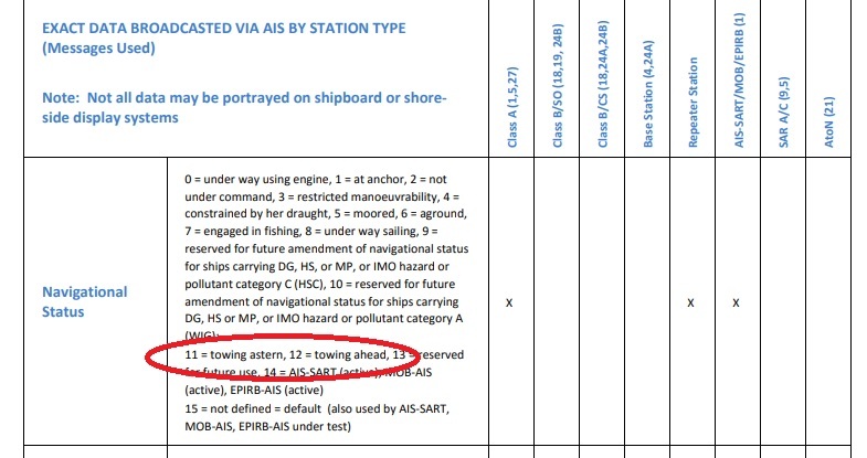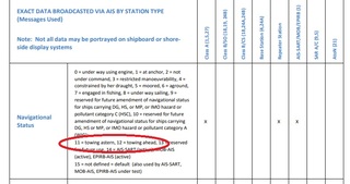 Est-ce que le remorqueur indiquait sa condition de navigation (Navigational Status)? Il y a deux categories specifiques, .11. remorque a l arriere, .12. remorque poussee.