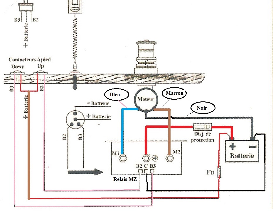 Bonjour est-ce que quelqu'un pourrait m'aider pour le branchement électrique dun guideau j'ai trois fils un bleu un marron un noir j'ai acheté un relais avec télécommande seulement je ne sais pas comment brancher ce Guindeau quand je le test il marche dans un sens ou dans l'autre mais j'ai l'impression qu'il me faut deux relais pour le faire marcher si quelqu'un peut m'aider merci