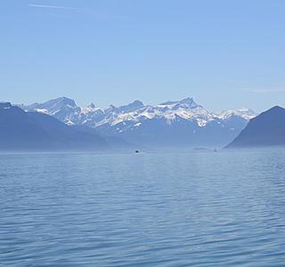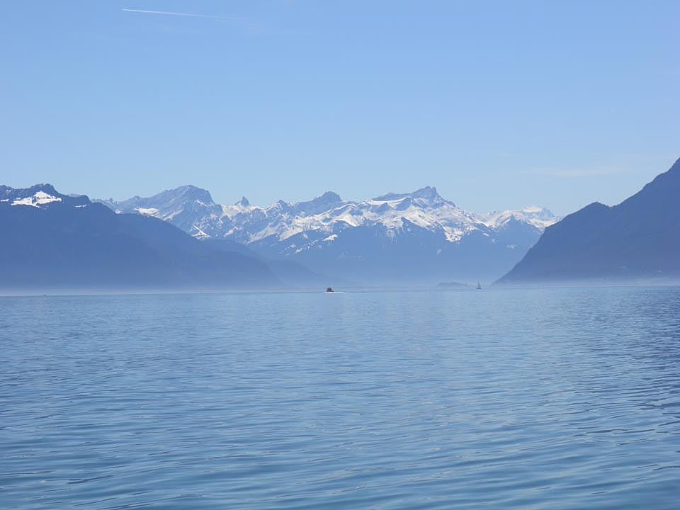 Je prends le chemin du retour le dimanche sous un soleil de plomb et la bienveillance de nos belles montagnes encores blanches, faisant un crochet par la Pichette pour voir des amis qui viennent d'y acheter un First 29 puis me mets en route sur le coup des 17h. À 21h15, après 4h de moteur, je m'arrête pour la nuit dans le port de Nyon d'où je repars le lendemain à midi et arrive à Genève après 2 nouvelles heures de moteur.