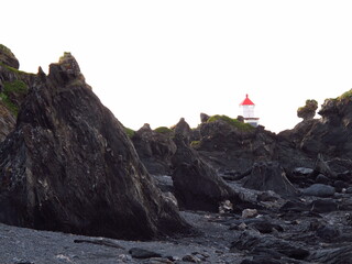 Le phare est en forme de cône allongé presque un cylindre avec des anneaux blancs/,gris