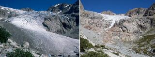 photos qui peuvent illustrer le réchauffement dans nos montagnes (glacier blanc dans le massif des Ecrins).1995,2018,2022