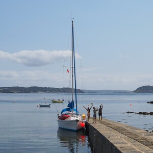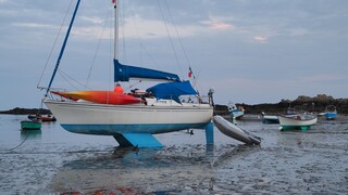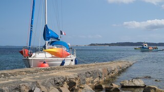 Il y a tout juste un mètre d’eau au plus bas de la cale lorsque nous arrivons et les quilles de notre Westerly frottent un peu sur le fond de roches. Comme le temps est très calme, cela ne pose aucun problème. Nous descendons les pare-battages au plus bas pour qu’ils ne passent pas au dessus du granit du plan incliné et portons deux aussières de pointe aux organeaux.