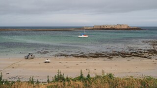 Le vent étant d'ouest lorsque nous arrivons, avec une houle à peine sensible annonçant le coup de vent du mois d'aout, je sais que nous serons abrités si nous mouillons au plus profond de la baie, côté nord-ouest, mais que la fenêtre n’est que de douze heures maximum, avant que les conditions ne nous imposent de migrer dans Bray bay, le port d'Alderney. On bougera sans doute autant au mouillage dans Bray bay que dans Longis Bay, mais on y sera en sécurité derrière l’immense digue, ce qui n'est pas le cas à Longis, lorsque les vents tournent au sud-ouest.